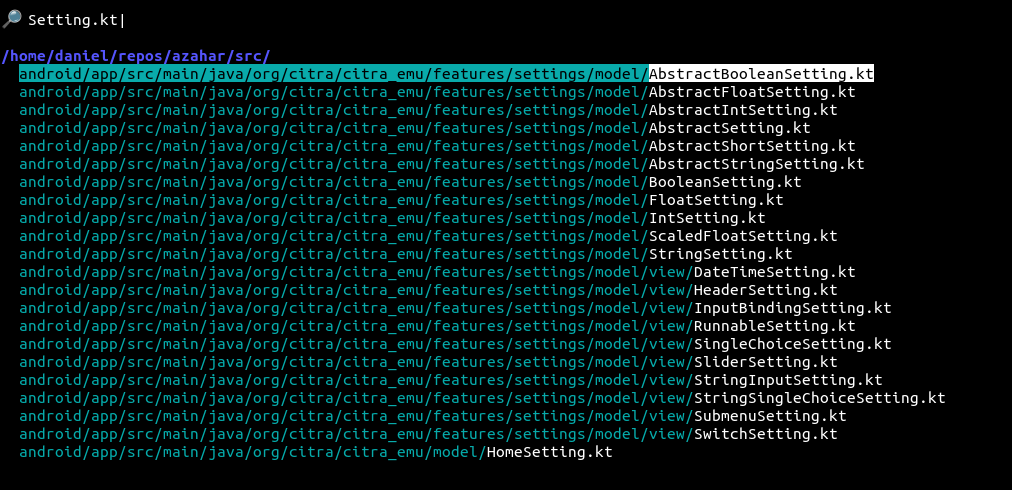 Once the file has been selected, its filename relative to the project directory is copied to the clipboard and printed to the terminal. This copied path can then be used elsewhere, such as within Emacs's find-file.